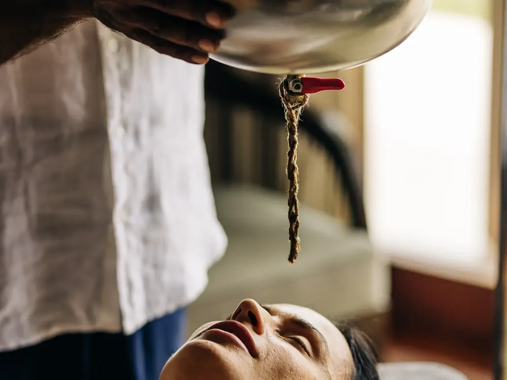 This ancient Ayurvedic ritual flows warm herbal oil continuously across your forehead, calming the mind and restoring inner balance.